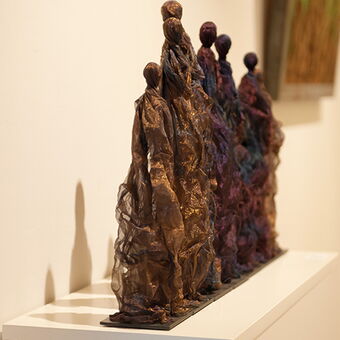 Jeder Blick zeigt Überraschungen Im grossen Foyer fällt der erste Blick des Besuchers zuerst auf das Bild «Im Café» von Jeanine Käser; mittels Gouache auf Kartonpapier zeigt sie lebensgrosse Café-Gäste an Plastiktischen. Die Dimensionen beeindrucken, und man vermeint die Szene wie durch eine dunkle Sonnenbrille – im Vorübergehen – zu betrachten. Käser ist die jüngste Teilnehmerin, und so ist auch ihre Malweise – frisch und energisch. Rechterhand zeigt Andrea da Cappo mit «Bluelounge» das Porträt einer sich räkelnden Frau in leuchtenden Blautönen, expressionistisch und doch lebensnah. Die Zusammenstellung beider Werke zeigt die gelungene Konzeption der Ausstellung: Durch die Gruppierung der beiden Werke treten ihre Figuren in einen spannenden Dialog – das Frauenporträt begutachtet die Café-Szene von nebenan.