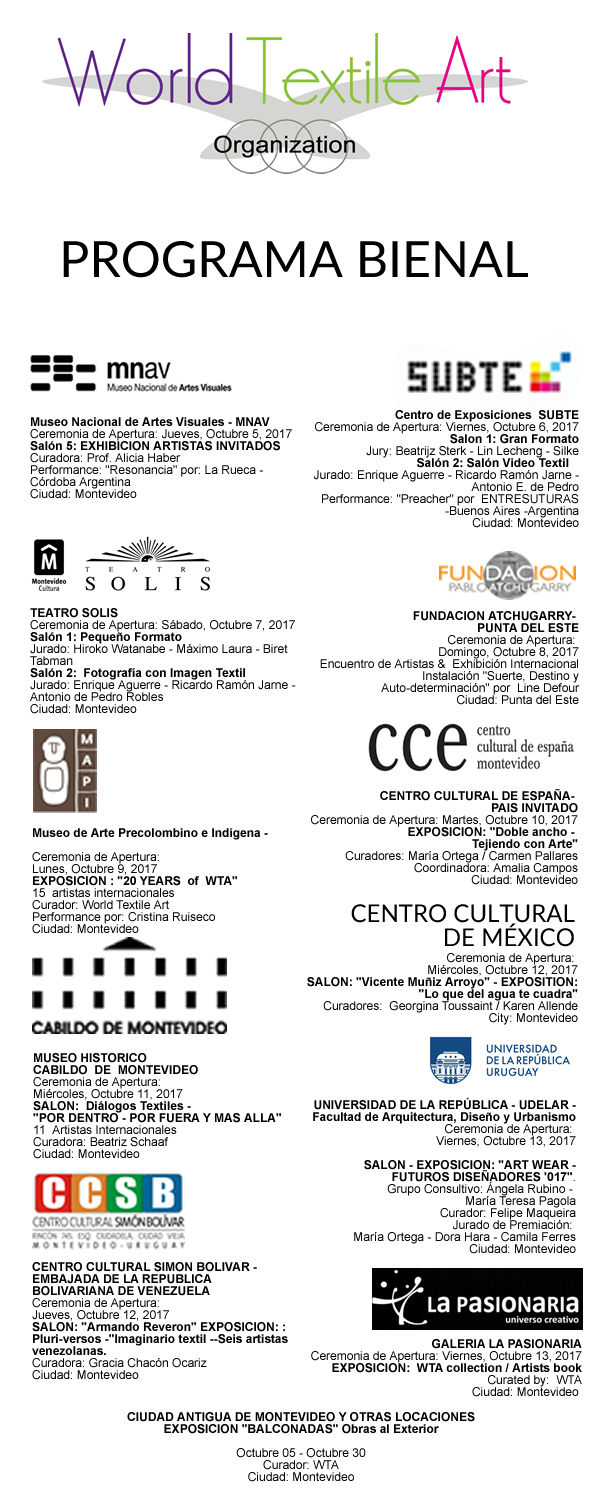 The 7th WTA International Biennial of Contemporary Textile Art will take place during the month of October 2017 in Montevideo, Uruguay. It is expected to be the largest event of its class in Uruguay's History.