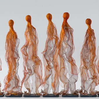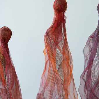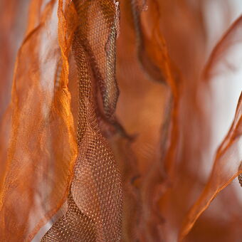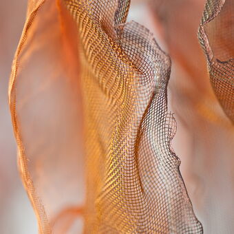 Objekte aus rostfreiem Stahlgeflecht oxidiert und teilweise brüniert, und Kupfer